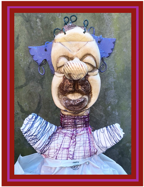 I decided to alter her face a bit with foil and pulp. Because the glasses had given her such a big nose, it seemed to me that her top lip needed beefing up a bit to meet and match the nose.