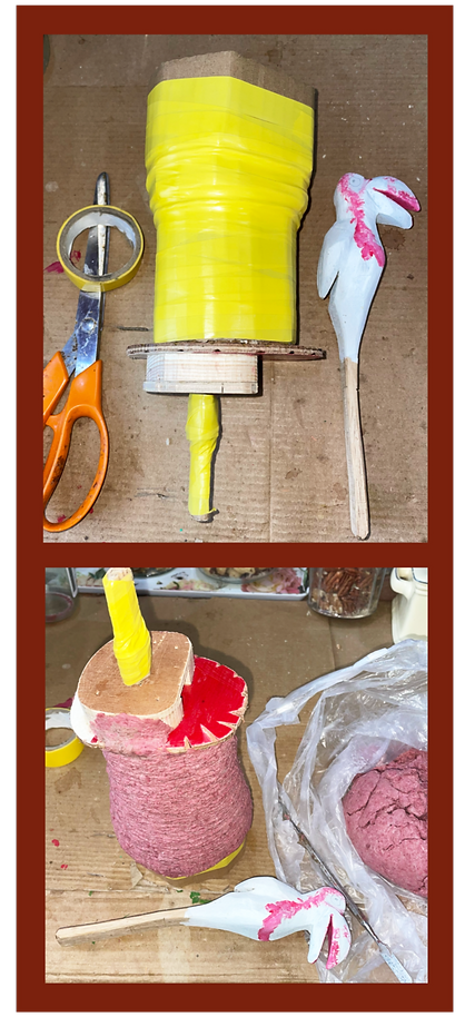 A wooden centre is hot glued into place, a dowel lined up right through horizontally. Flat end sections of plywood are tacked into place also with hot glue.